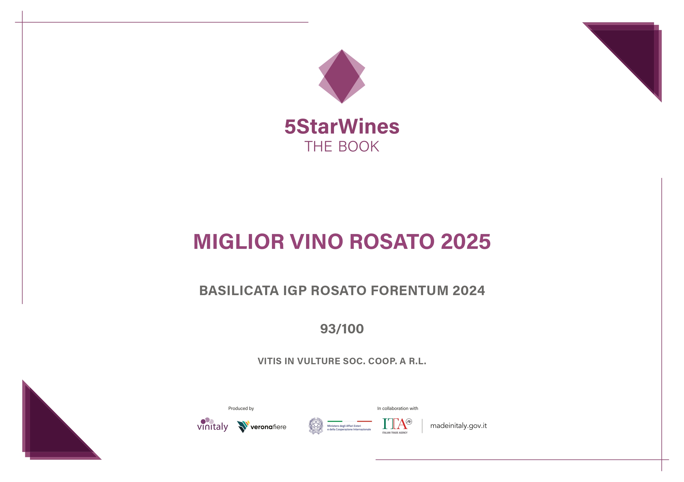 Il Forentum Rosato IGT Basilicata 2024 si posiziona nella guida 5 StarWines di Vinitaly al primo posto, ottenendo il premio di Miglior Rosato.