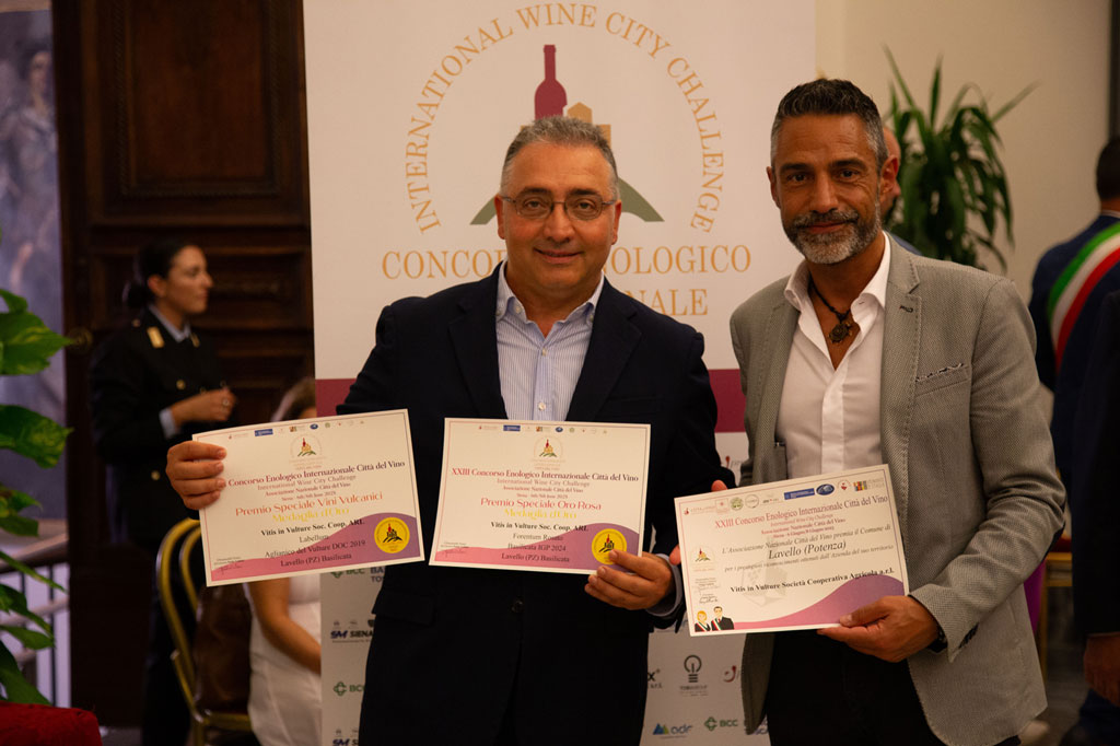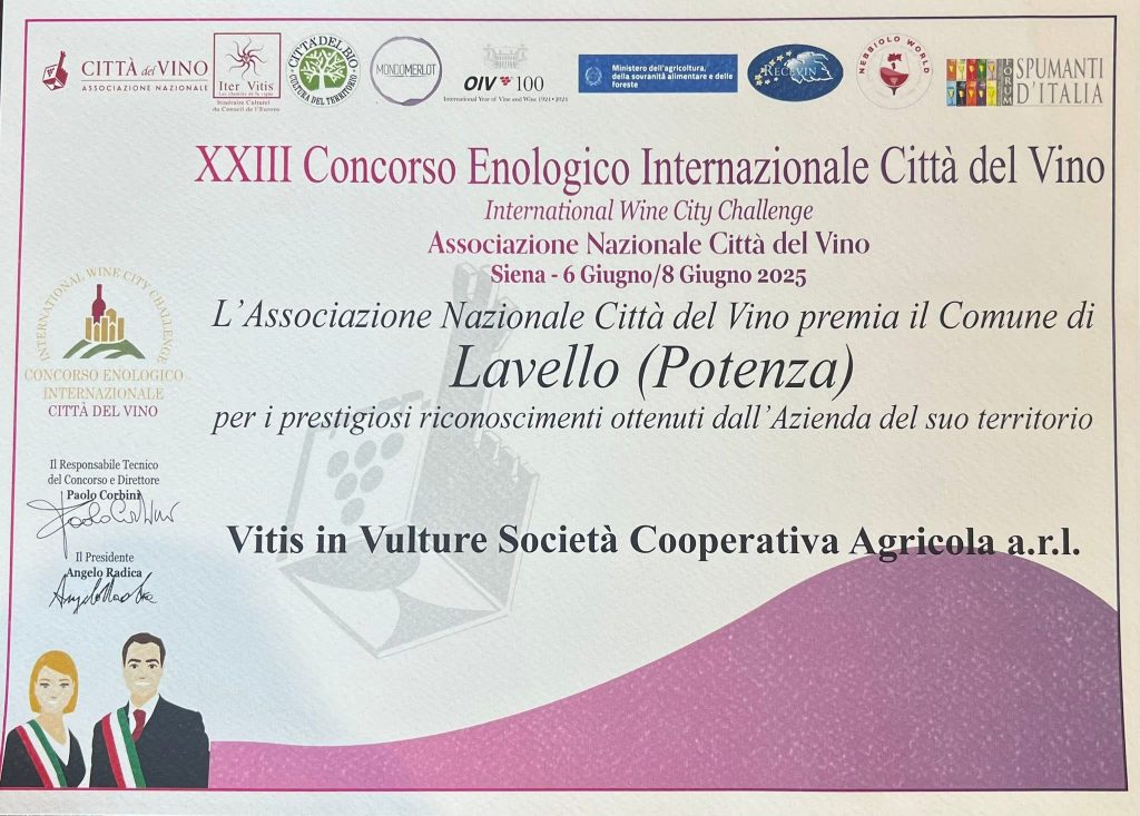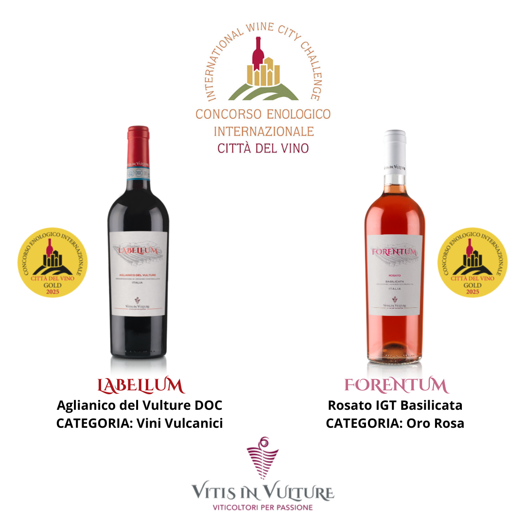 La XXIII edizione del Concorso Enologico Internazionale Città del Vino vede Vitis in Vulture premiata presso la Sala della Protomoteca in Campidoglio di 2 medaglie d’oro per le categorie “Vini Vulcanici” con il Labellum Aglianico del Vulture DOC 2019, e “Oro Rosa” con il Forentum Rosato IGT Basilicata 2024.
